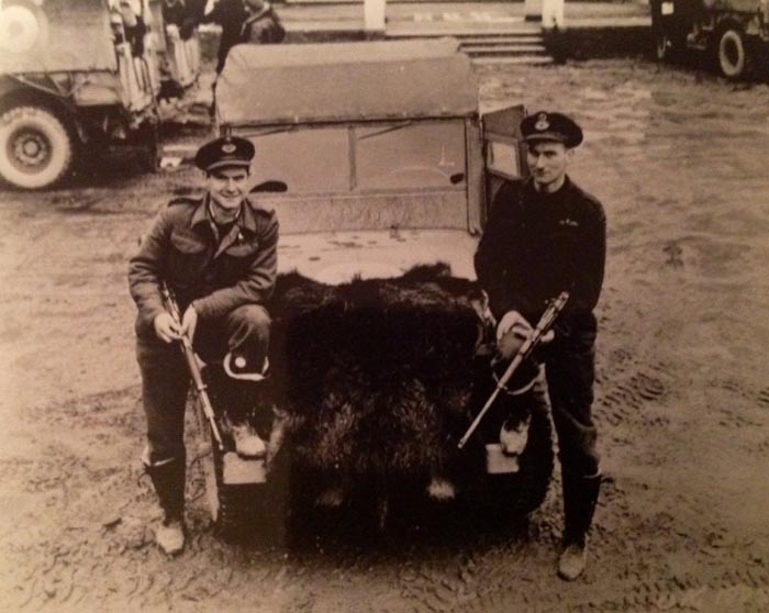 Davidson, J. W. Fullerton and boar skin, at Pisciculture, Amiens-Glisy winter 1945.